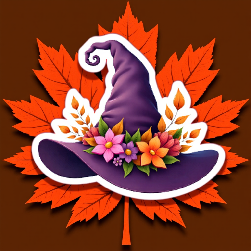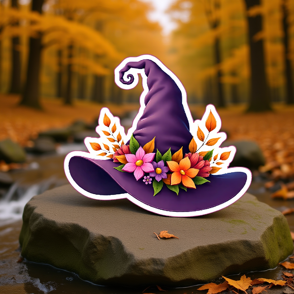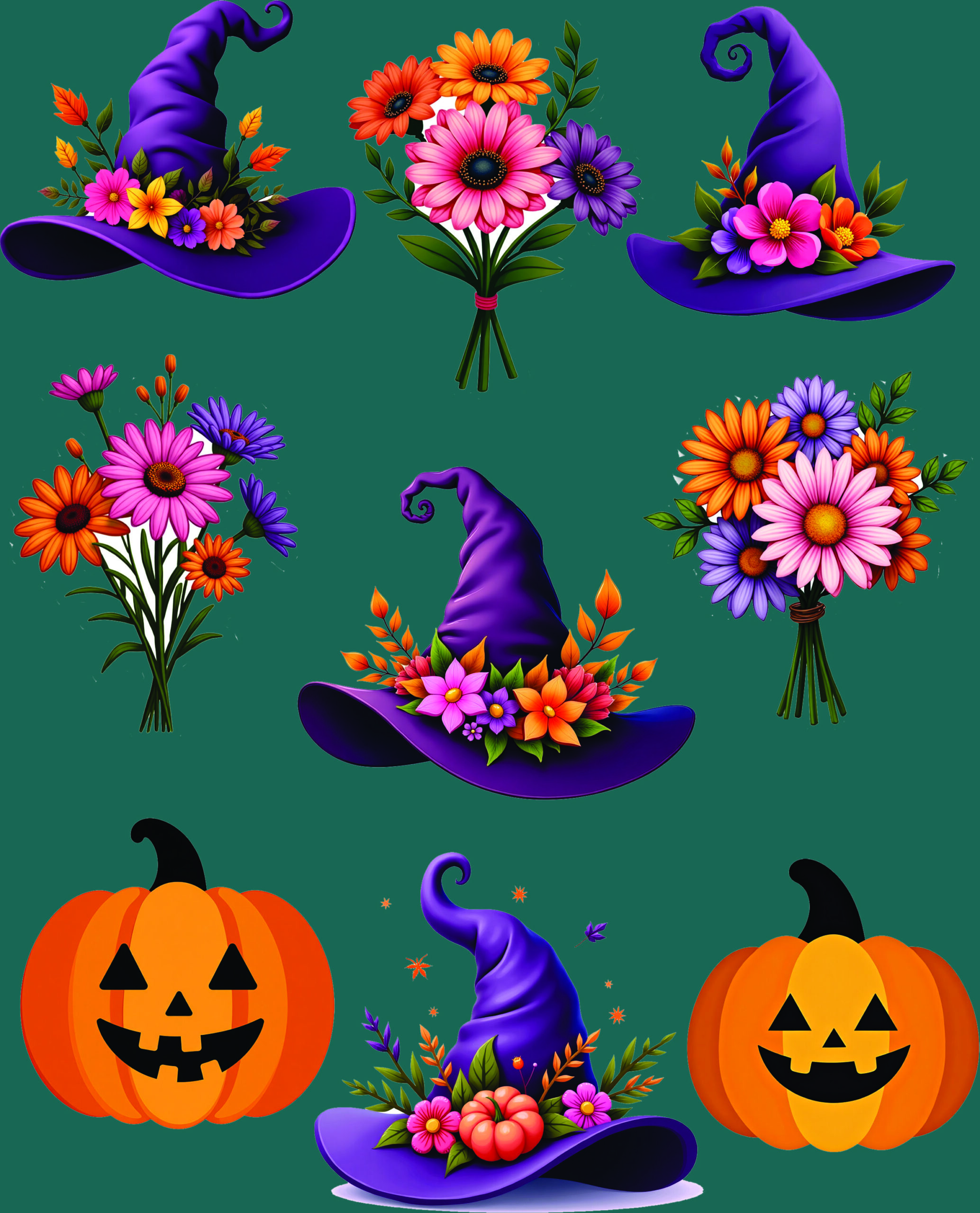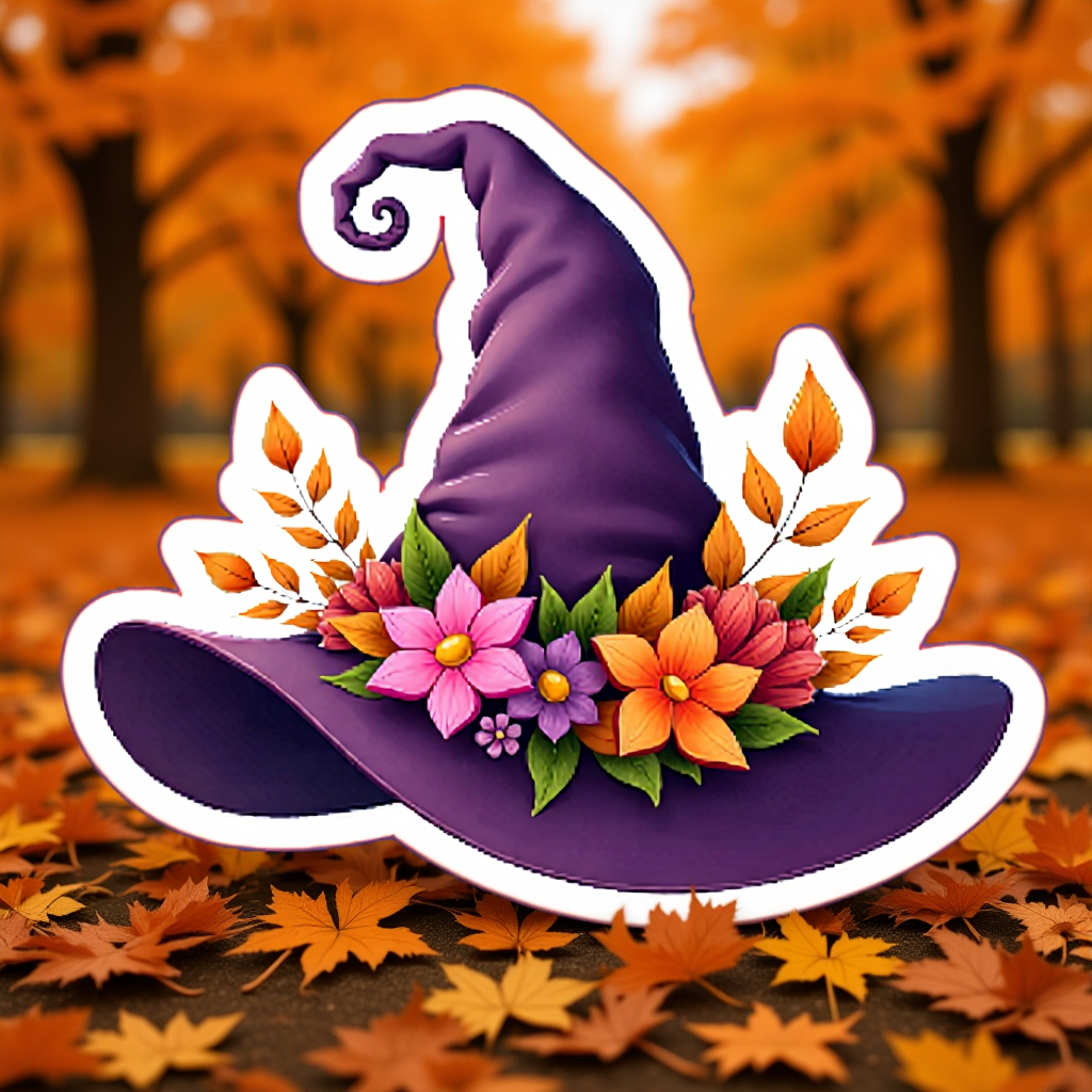 🪄 A matching purple witch hat decorated with pumpkins, flowers, and leafy accents.