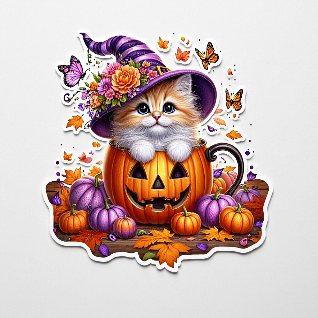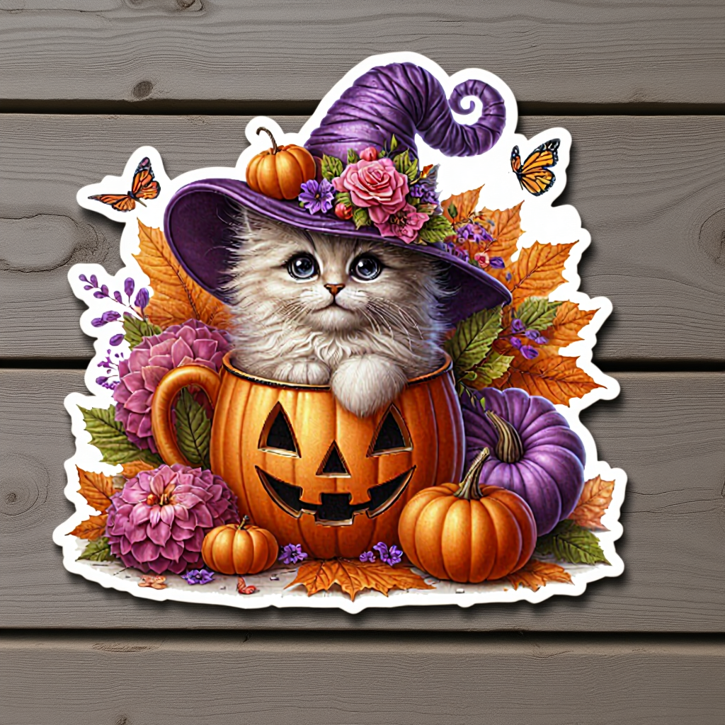 🧙♀️ A fluffy orange kitten peeking from a jack-o’-lantern mug, wearing a purple witch hat adorned with flowers and butterflies.